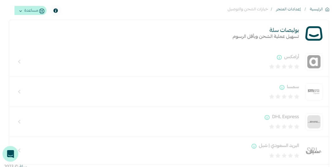 في صفحة خيارات الشحن، ستجد العديد من شركات الشحن التي تدعمها منصة سلة. أو يمكنك الضغط على زر إضافة شركة شحن جديدة.